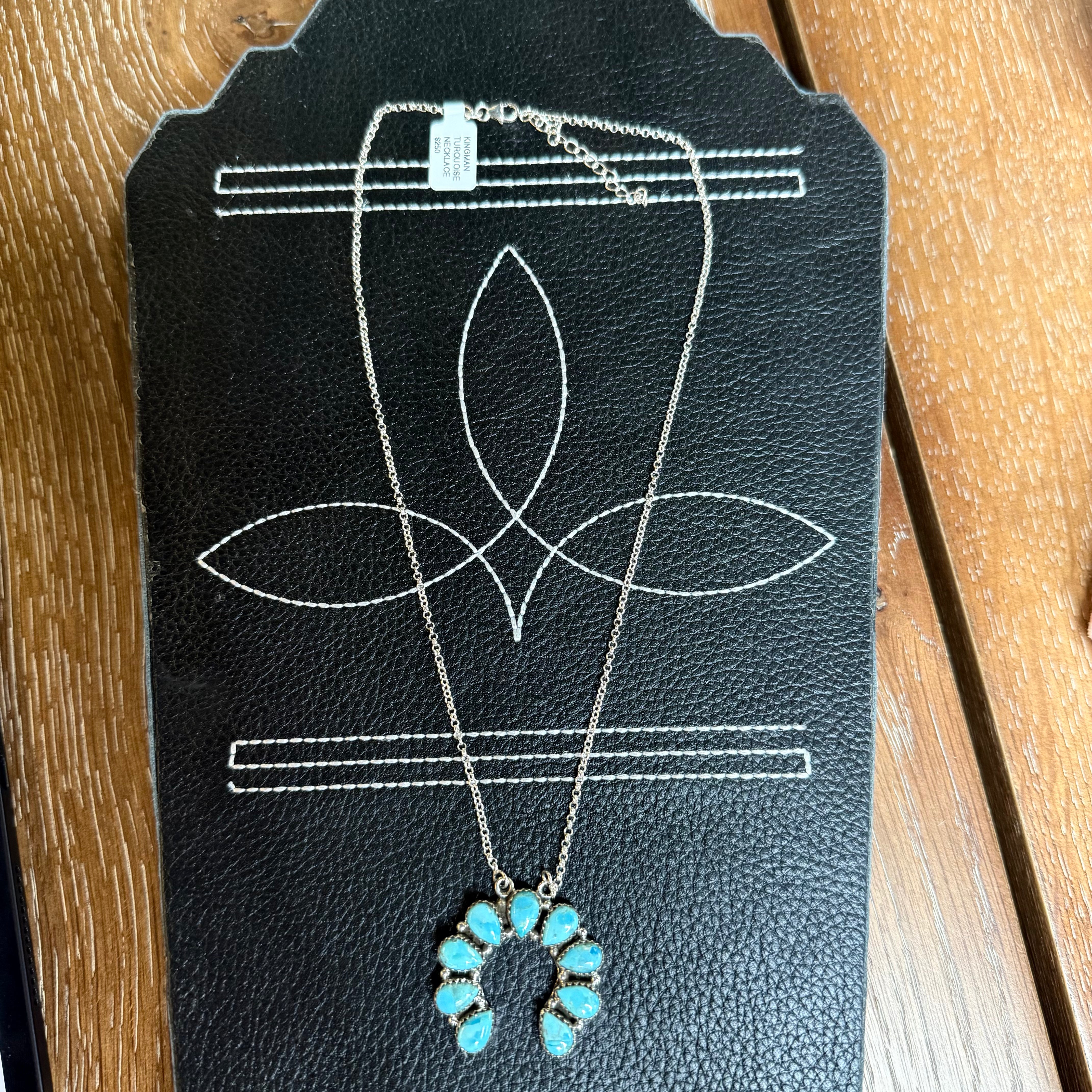 Crafted with genuine Kingman turquoise straight outta Arizona, this dainty squash blossom pendant is a nod to tradition with a fresh, wearable twist. The signature robin’s egg blue stones are known for their dreamy matrix and timeless beauty—set in a delicate crescent that hangs from a sterling silver chain.