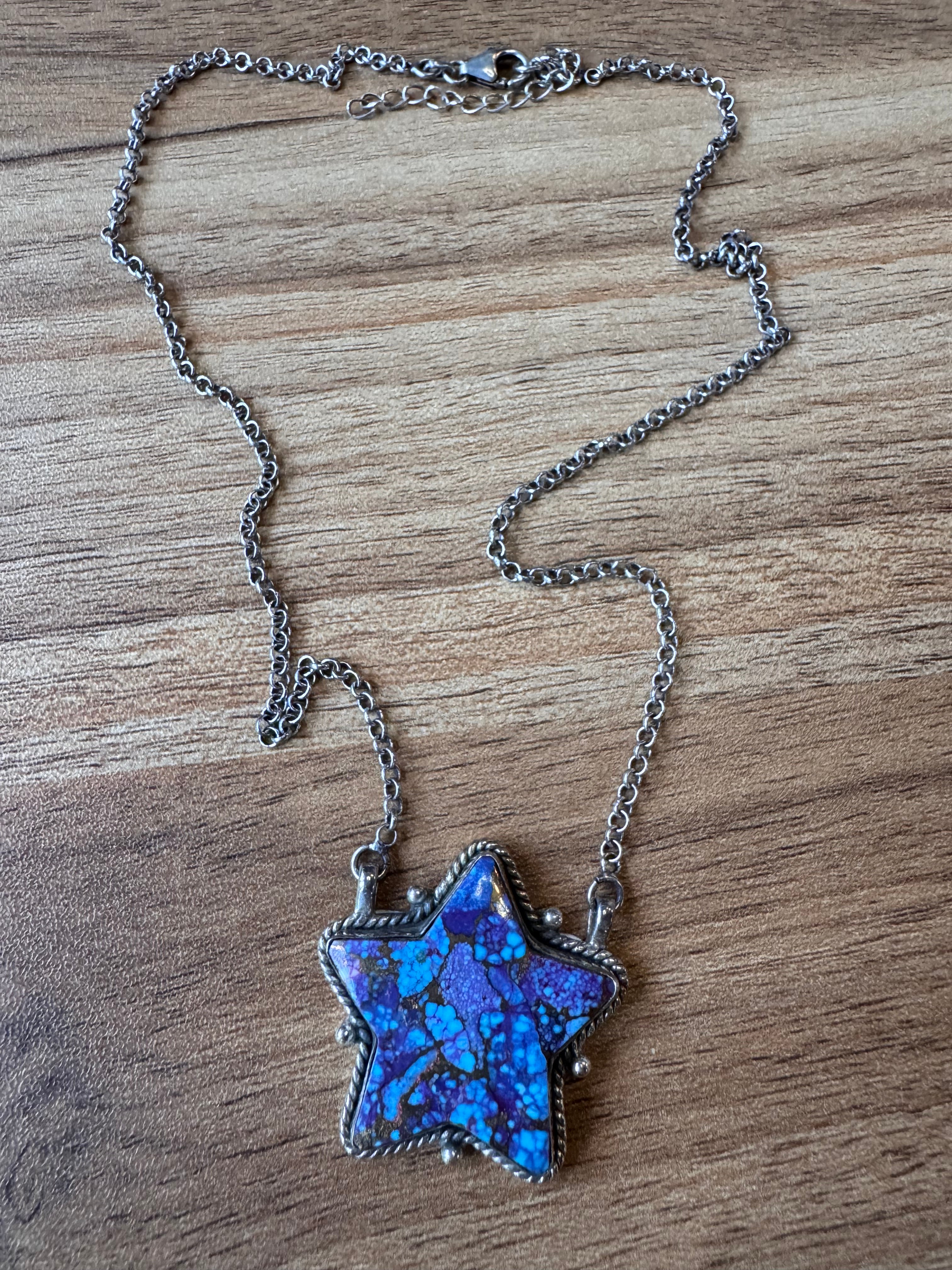 Shine bright in bold desert hues with this Purple Mojave Turquoise Star Necklace from the Hada Collection. Crafted in sterling silver, this one-of-a-kind piece features a striking star-shaped pendant in rich purple Mojave turquoise, laced with vibrant blue and copper veining.