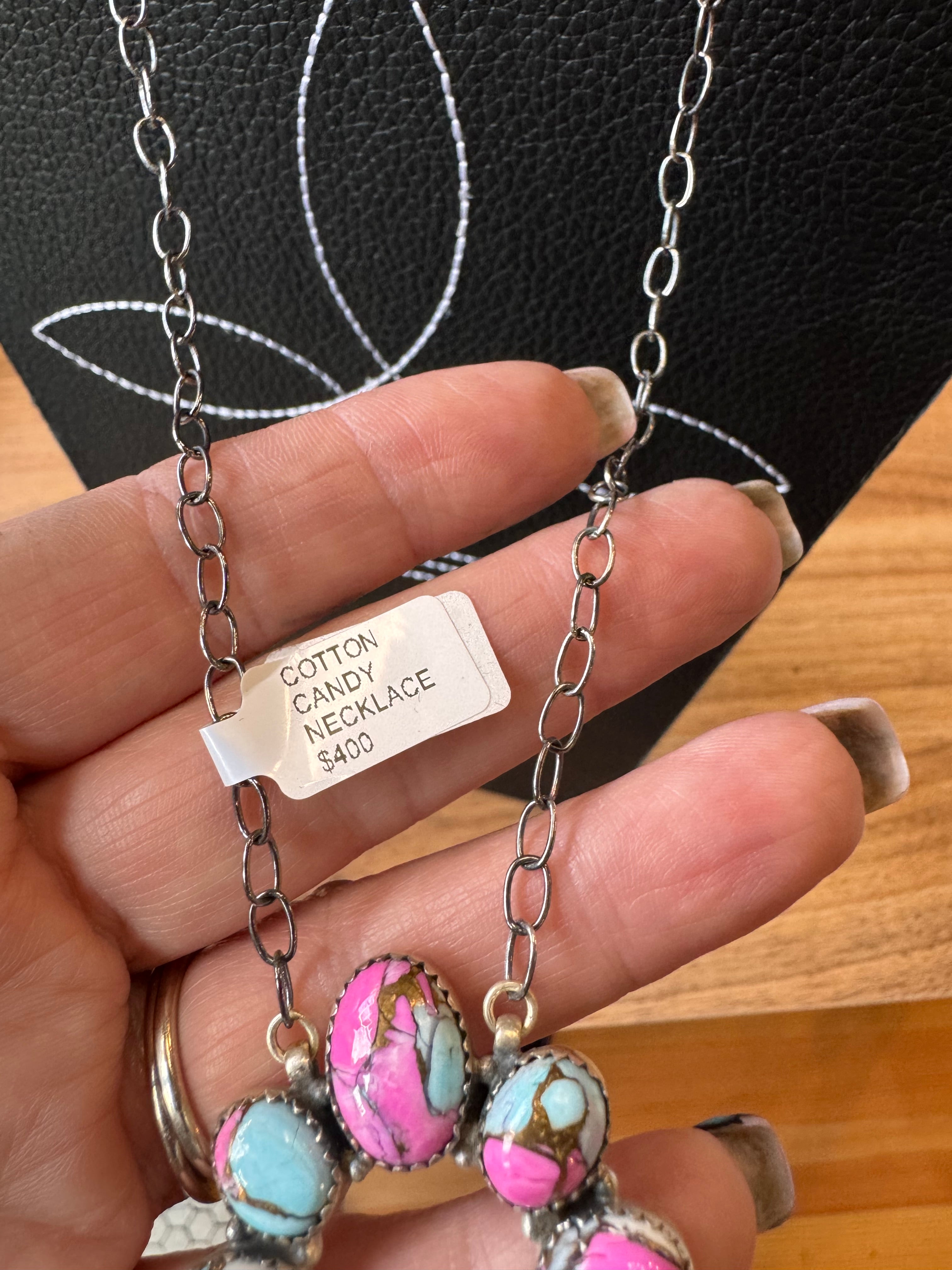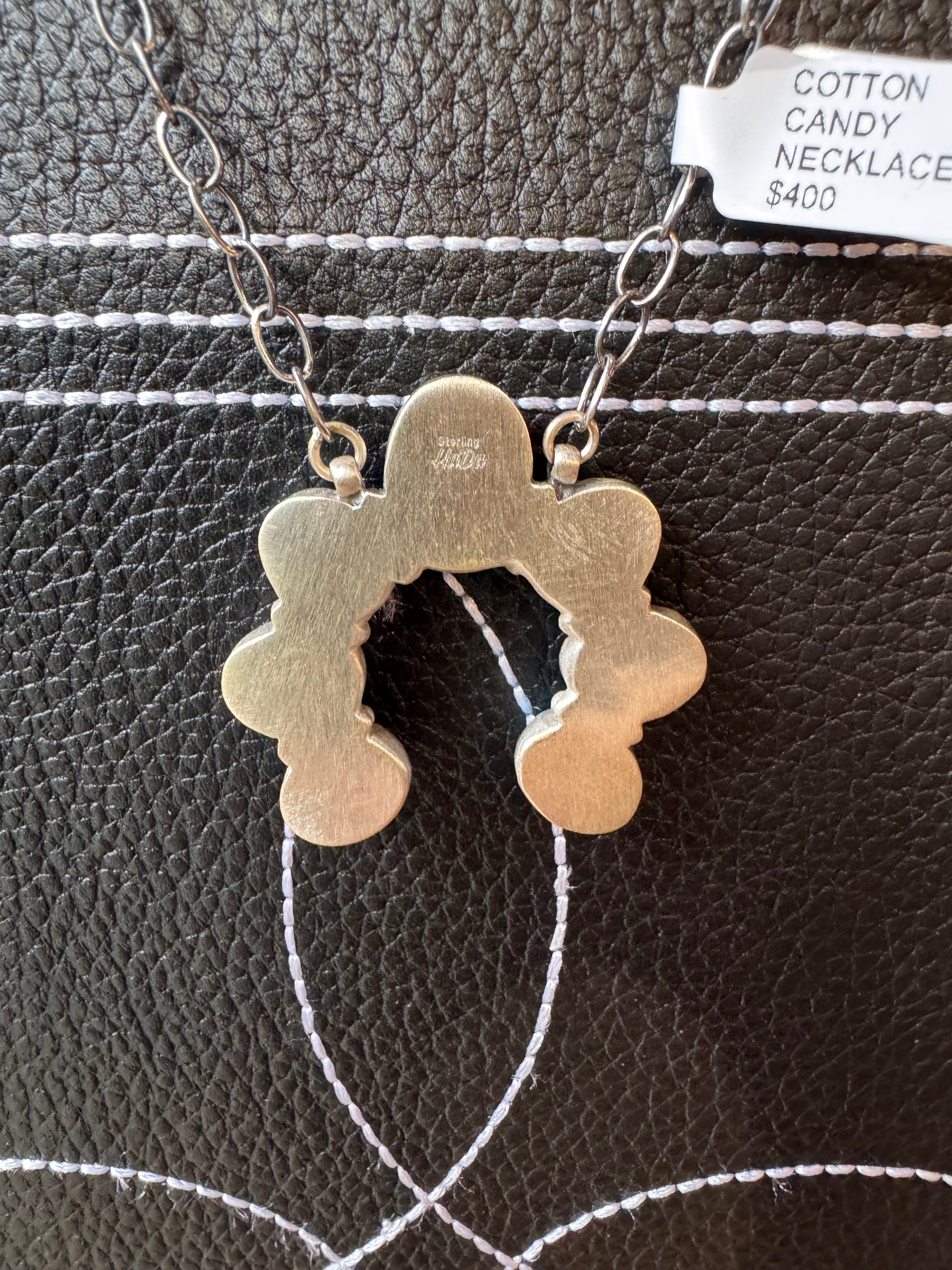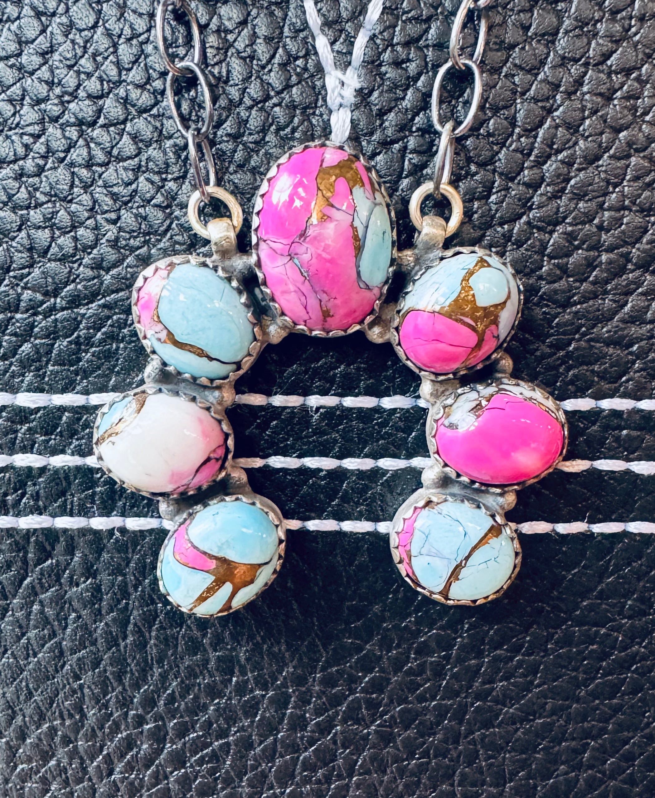 Sweet as spun sugar and bold as the desert sky, this Cotton Candy Squash Blossom Necklace is a statement piece that turns heads. Featuring a dreamy mix of pink, blue, and cream stones with natural veining, each gem is carefully set in oxidized sterling silver for a vintage-inspired finish.