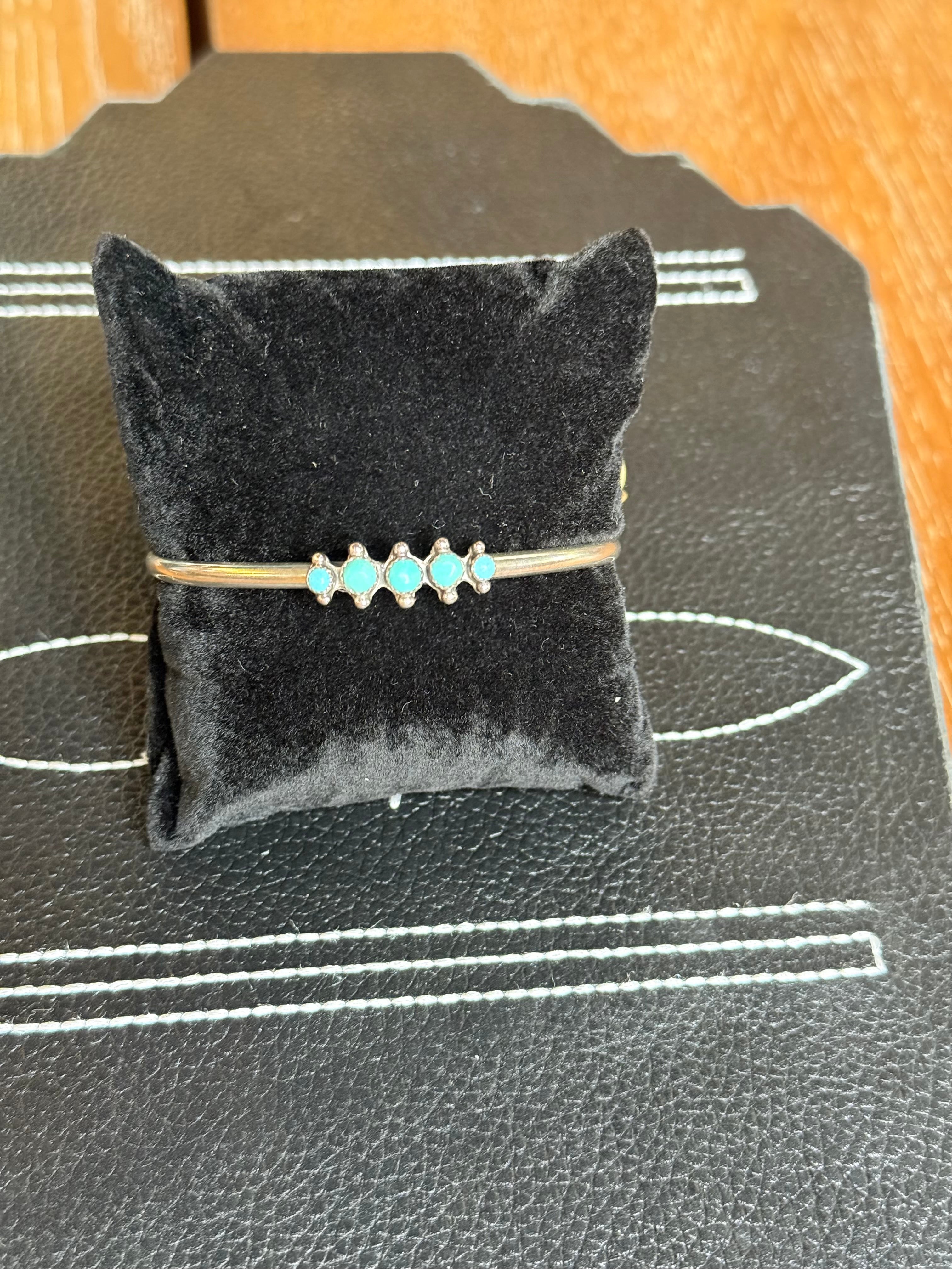 Simple, sweet, and oh-so-stunning. This sterling silver cuff features five petite Kingman turquoise stones nestled in a perfect row of silver bead accents. It’s the everyday bracelet you didn’t know you were missin’—layer it up or wear it solo for just a kiss of western class.
