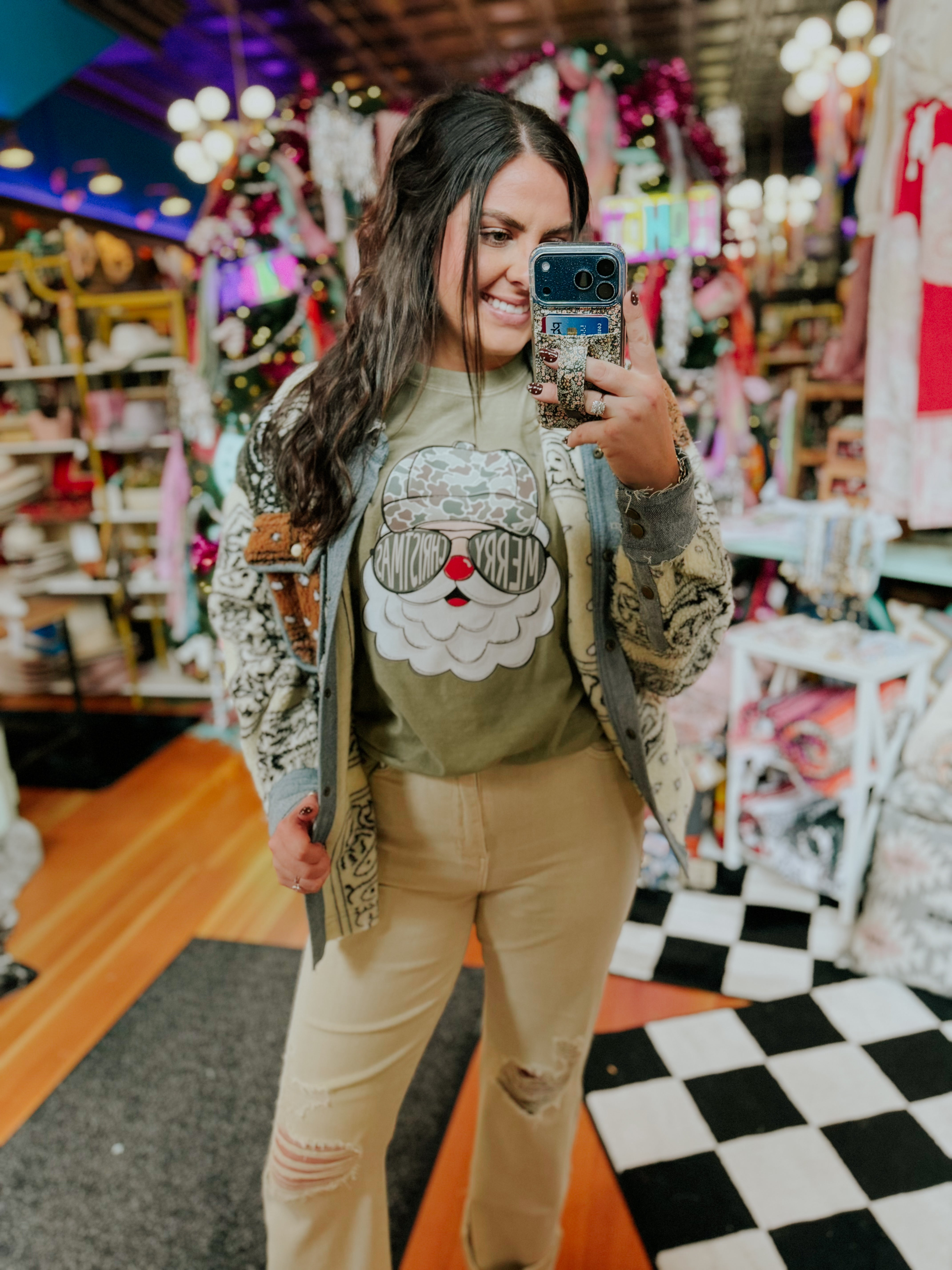Merry Camo Christmas Tee – Comfort Colors Green Santa Shirt (S–2XL)