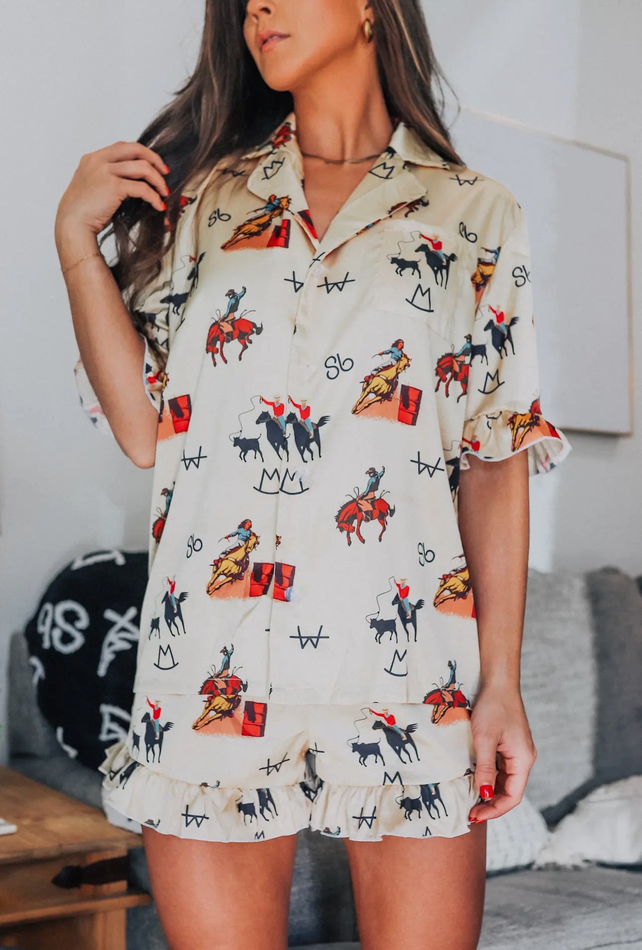 Vintage Western Pajama Set – 2-Piece Satin Button-Down with Ruffle Shorts