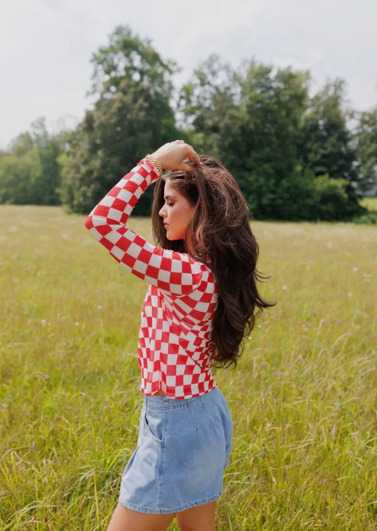 Red & White Checkered Sheer Mesh Top – Long Sleeve Layering Tee