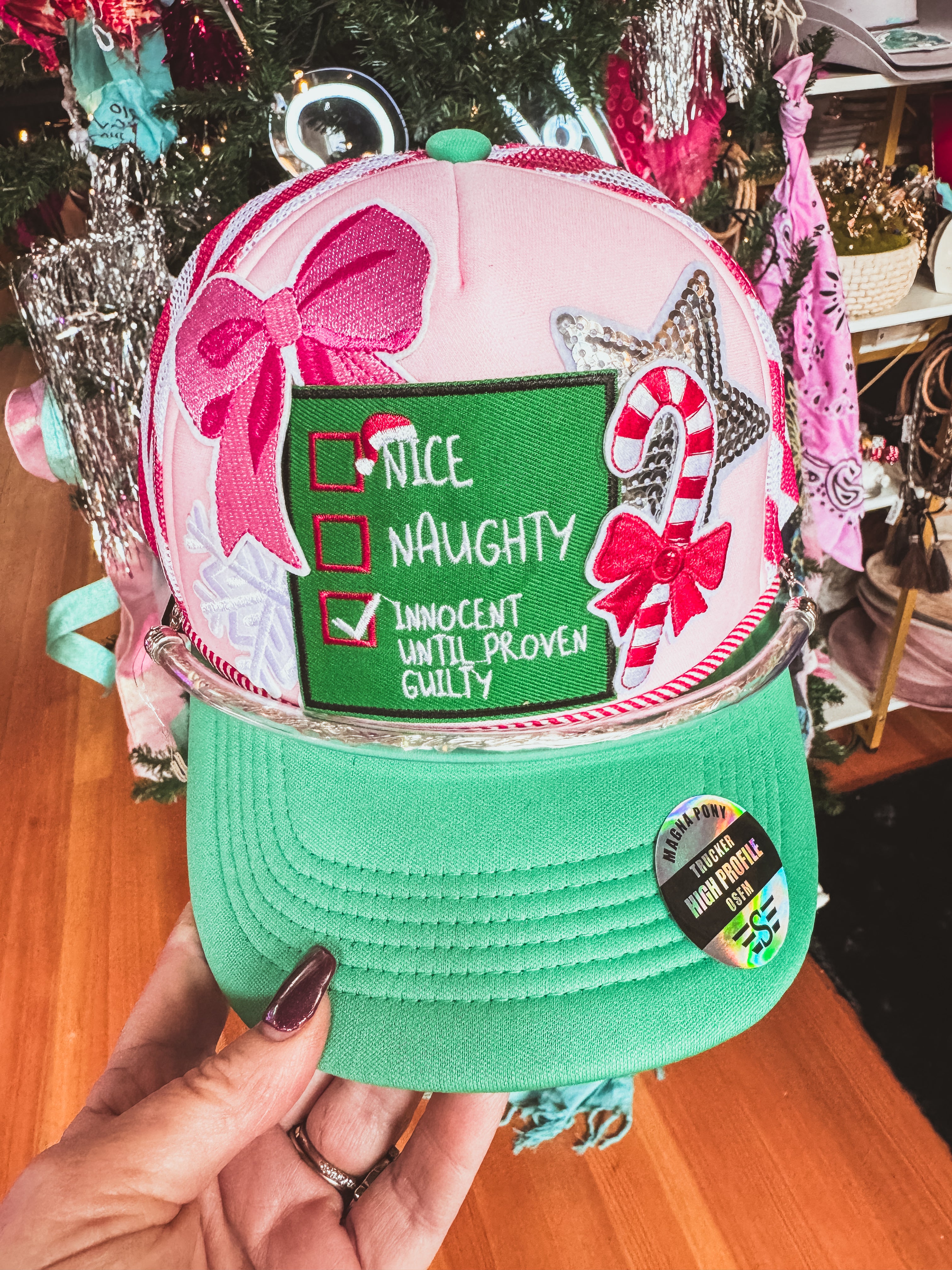 Green Suede “Maybe Christmas” Trucker Hat with Light-Up Garland Chain