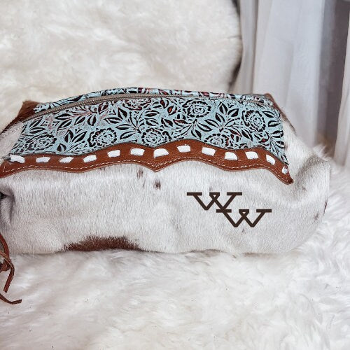 Custom Western Branded Cowhide Tooled Leather Cosmetic Shave Bag Initials Monogram Farm or Cow Brand Travel Shave Makeup Cow Print Gifts