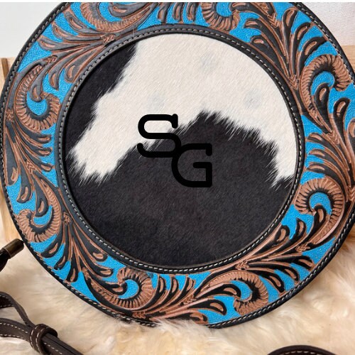 Custom branded Turquoise and Chocolate Cowhide Western Tooled Leather Round Canteen style Crossbody purse Farm Brand Cow Brand Initials