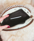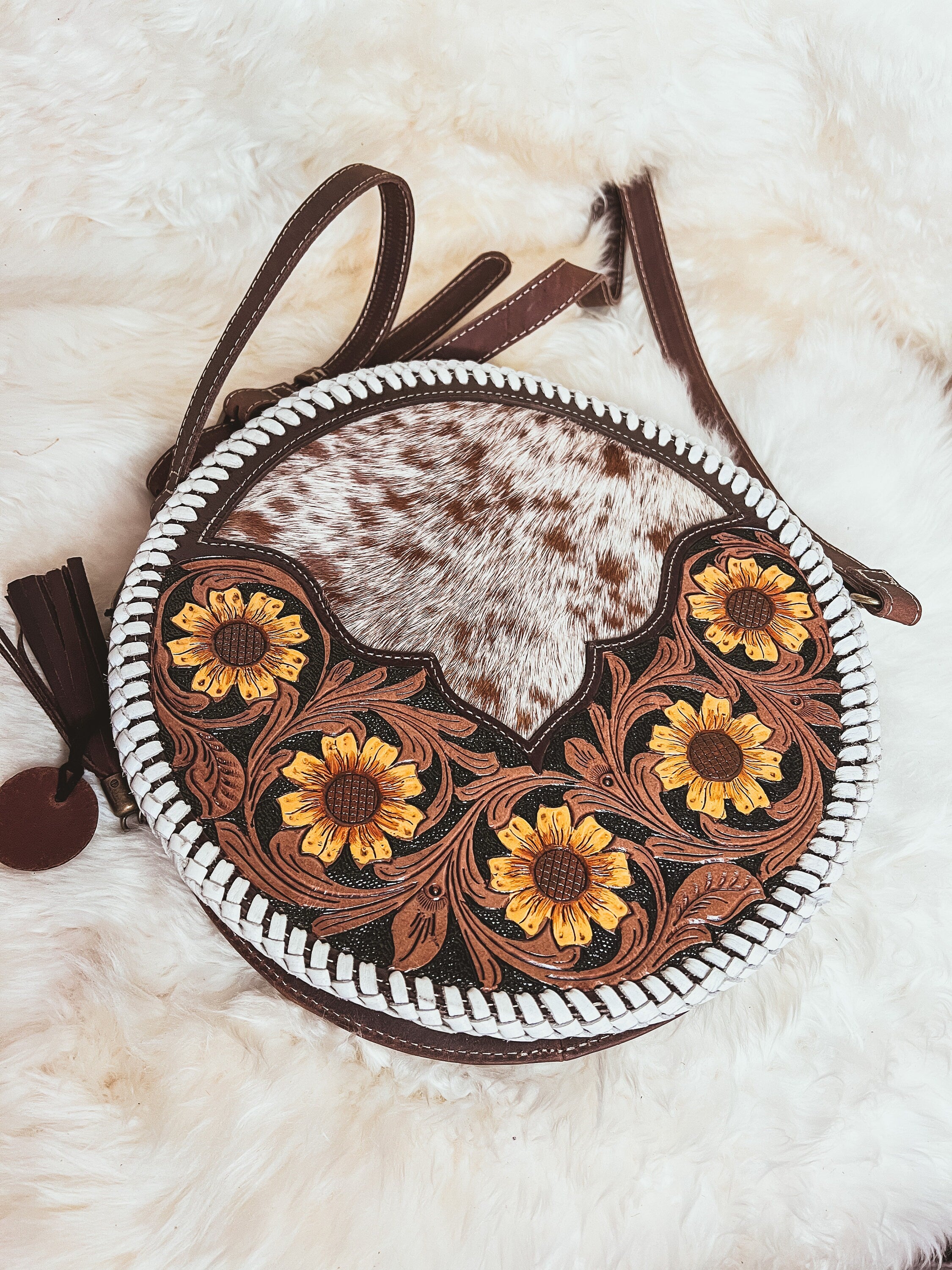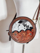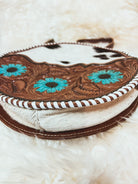 Custom Branded Cowhide Round Crossbody purse tooled leather Turquoise Flowers & Whipstitch