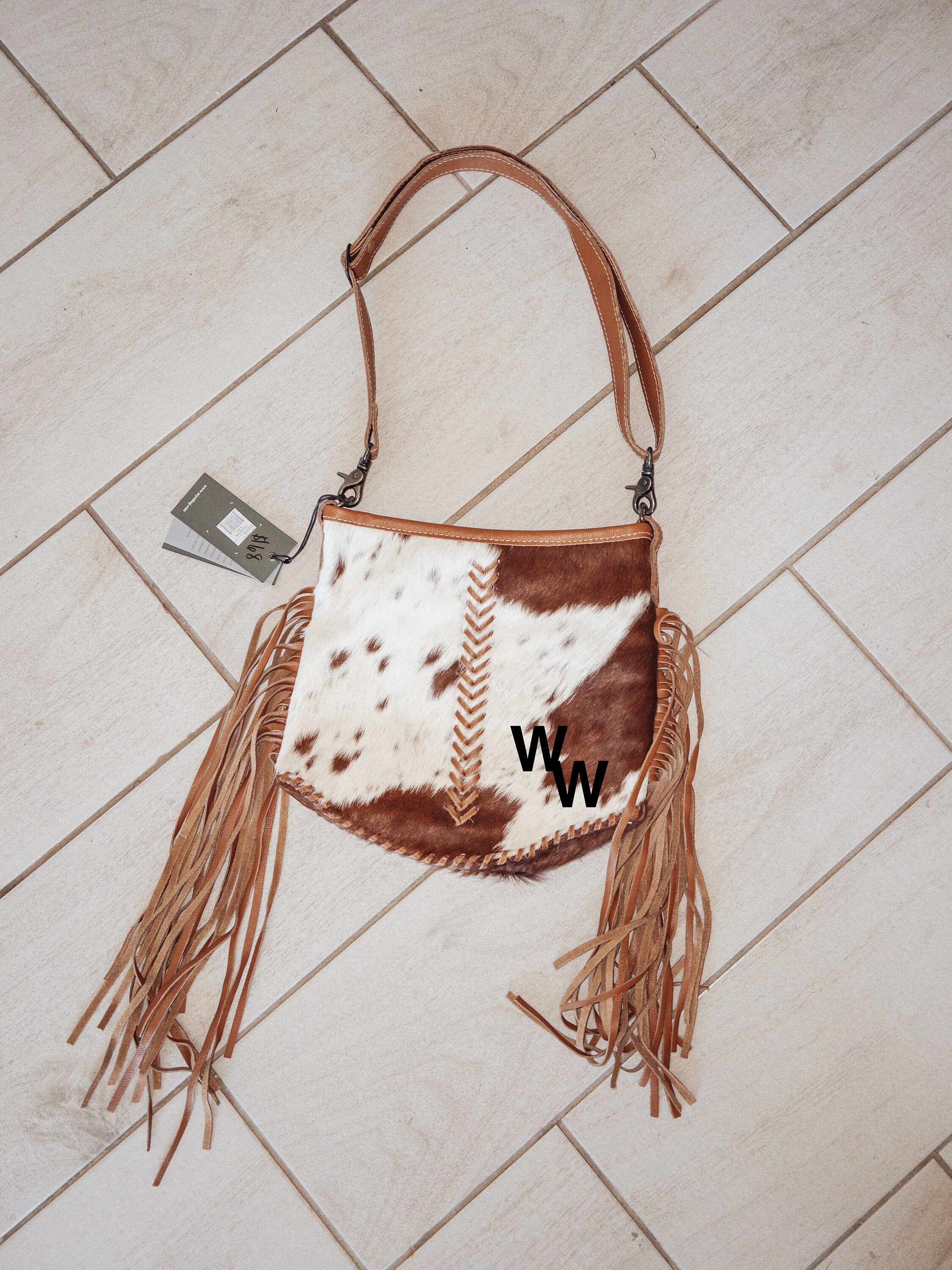 Bag measures approx 10” diameter and a 30” purse drop fully expanded, adjustable to smaller size, we add your custom initials or farm/cow brand,