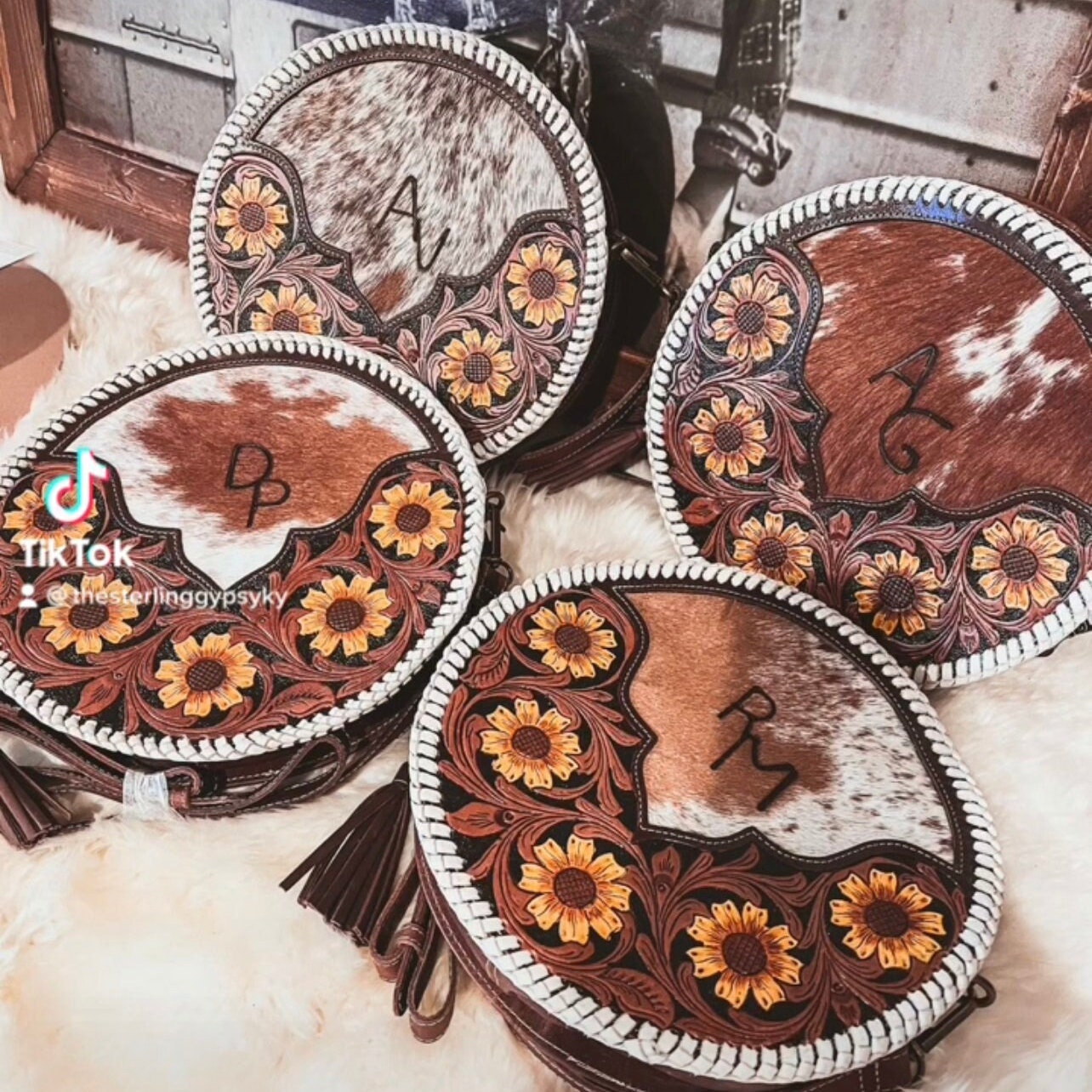 Custom Branded Cowhide tooled Leather Western Daisy with white whipstitch Round Crossbody Purse Initials Monogram Farm or Cow Brand