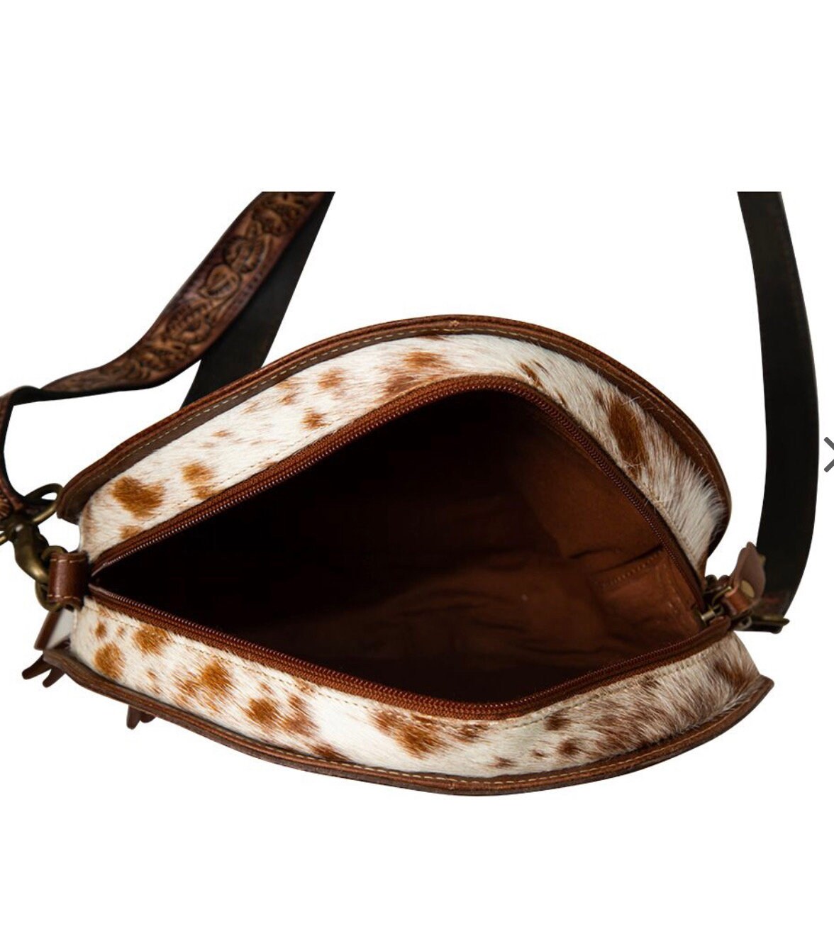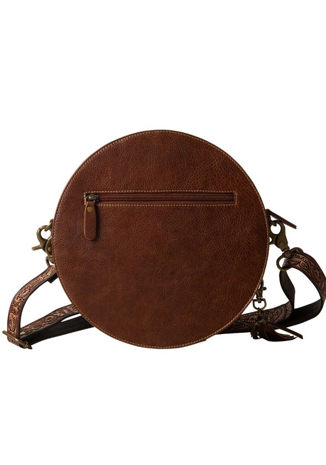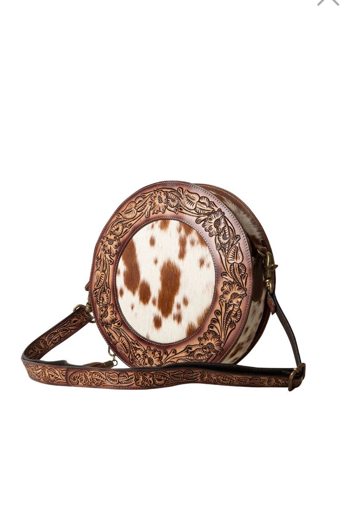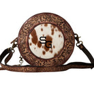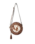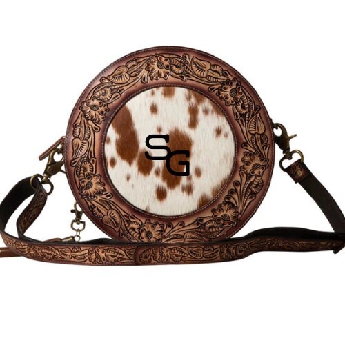 Custom branded Cowhide Western Tooled Leather Round Canteen style Crossbody purse Farm Brand Cow Brand Initials Monogram Guitar Strap