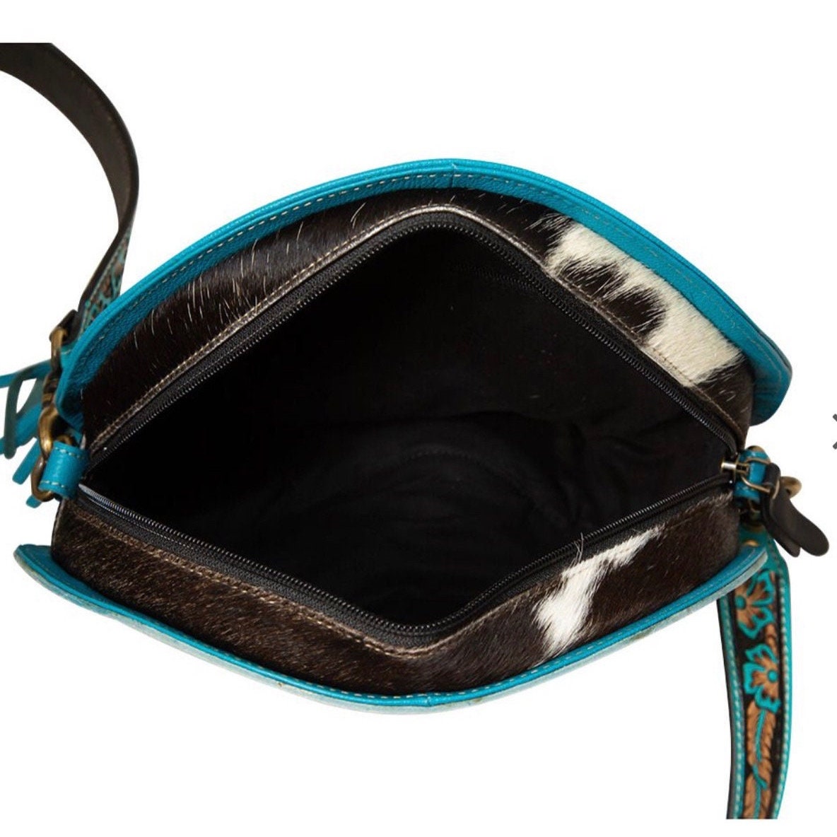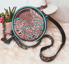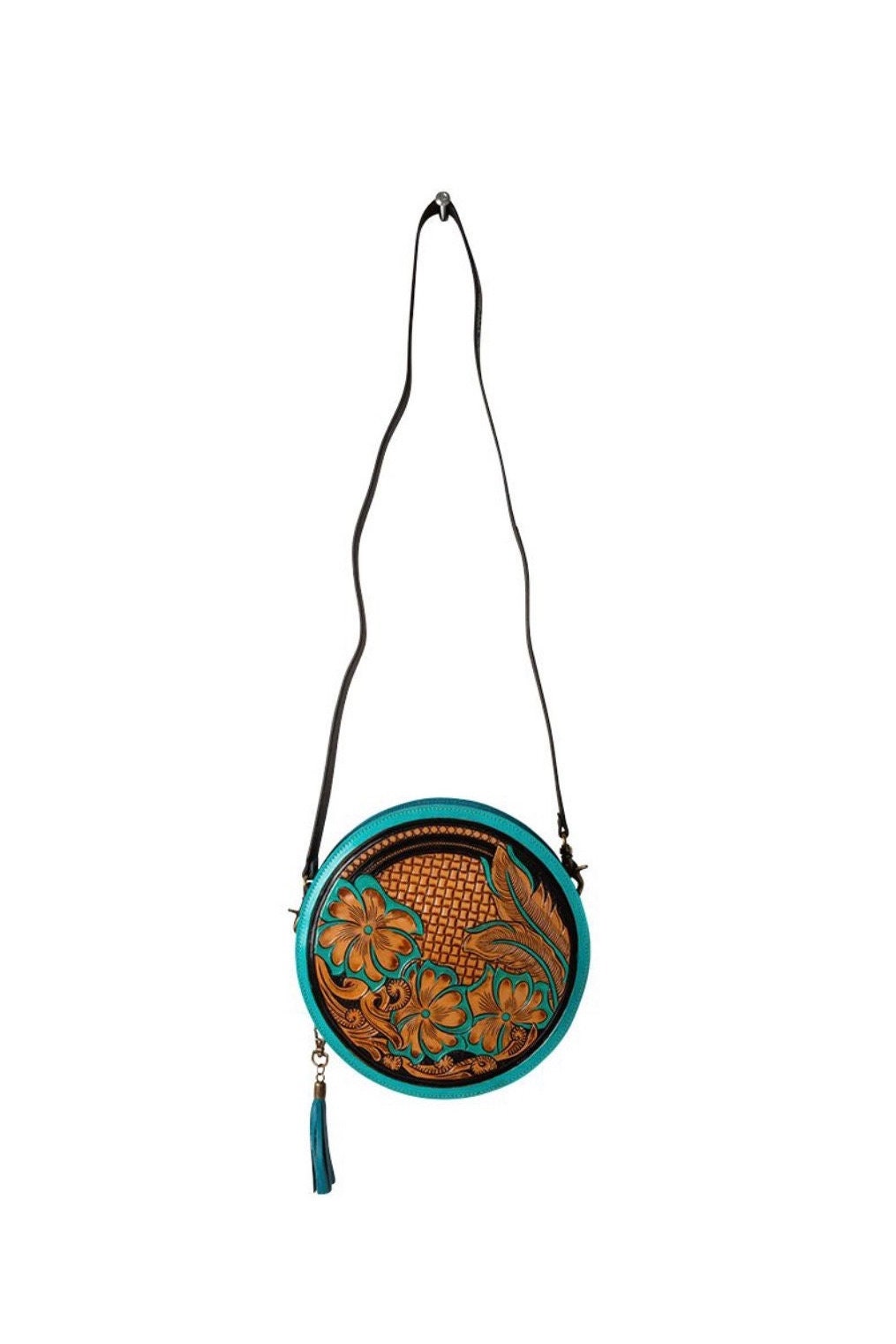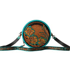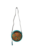 Turquoise Round tooled leather Western Crossbody Purse Initials guitar style strap Canteen Bag