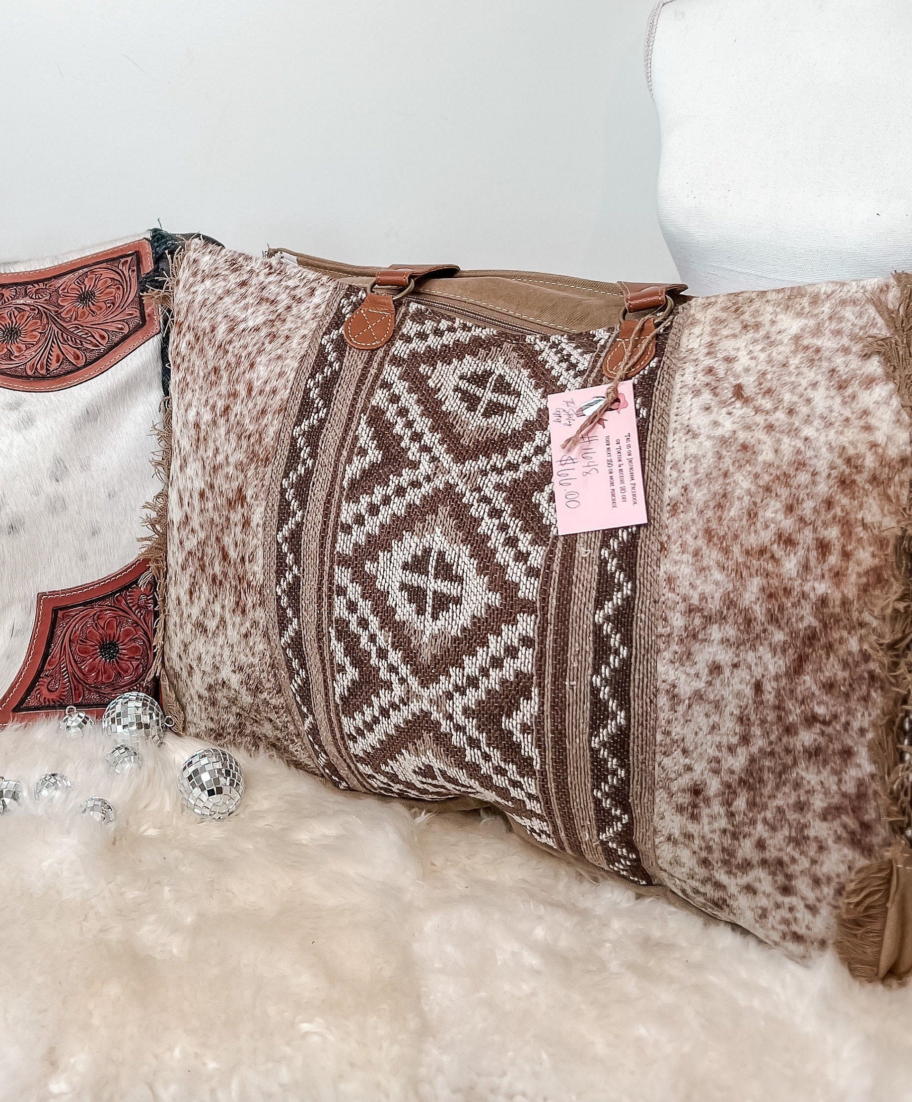 Western Cowhide & Aztec Weekender Tote Bag Travel Custom Branded Farm Brand Cow Brand Initials