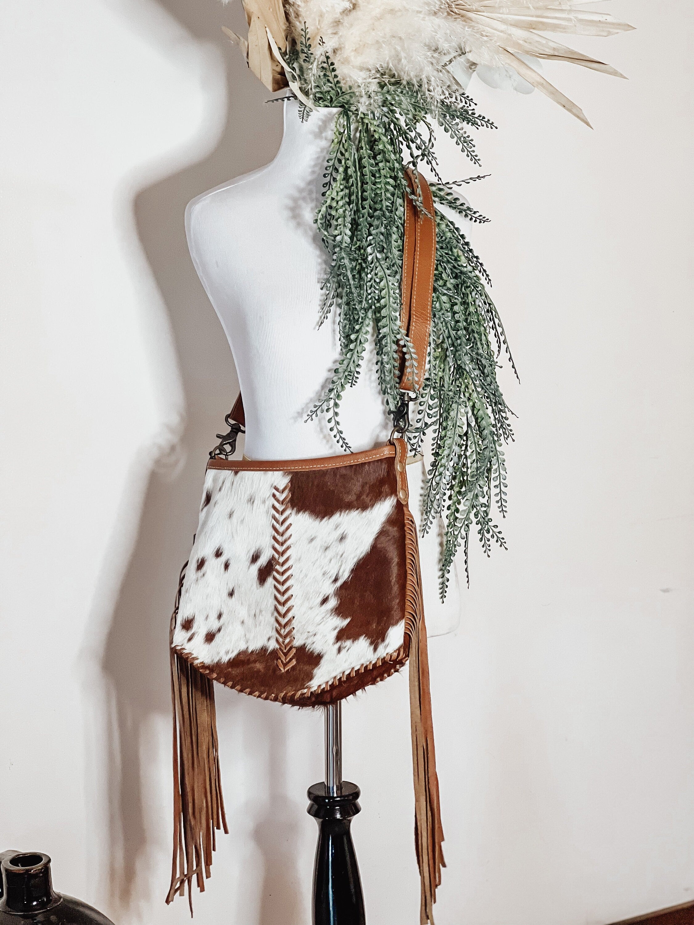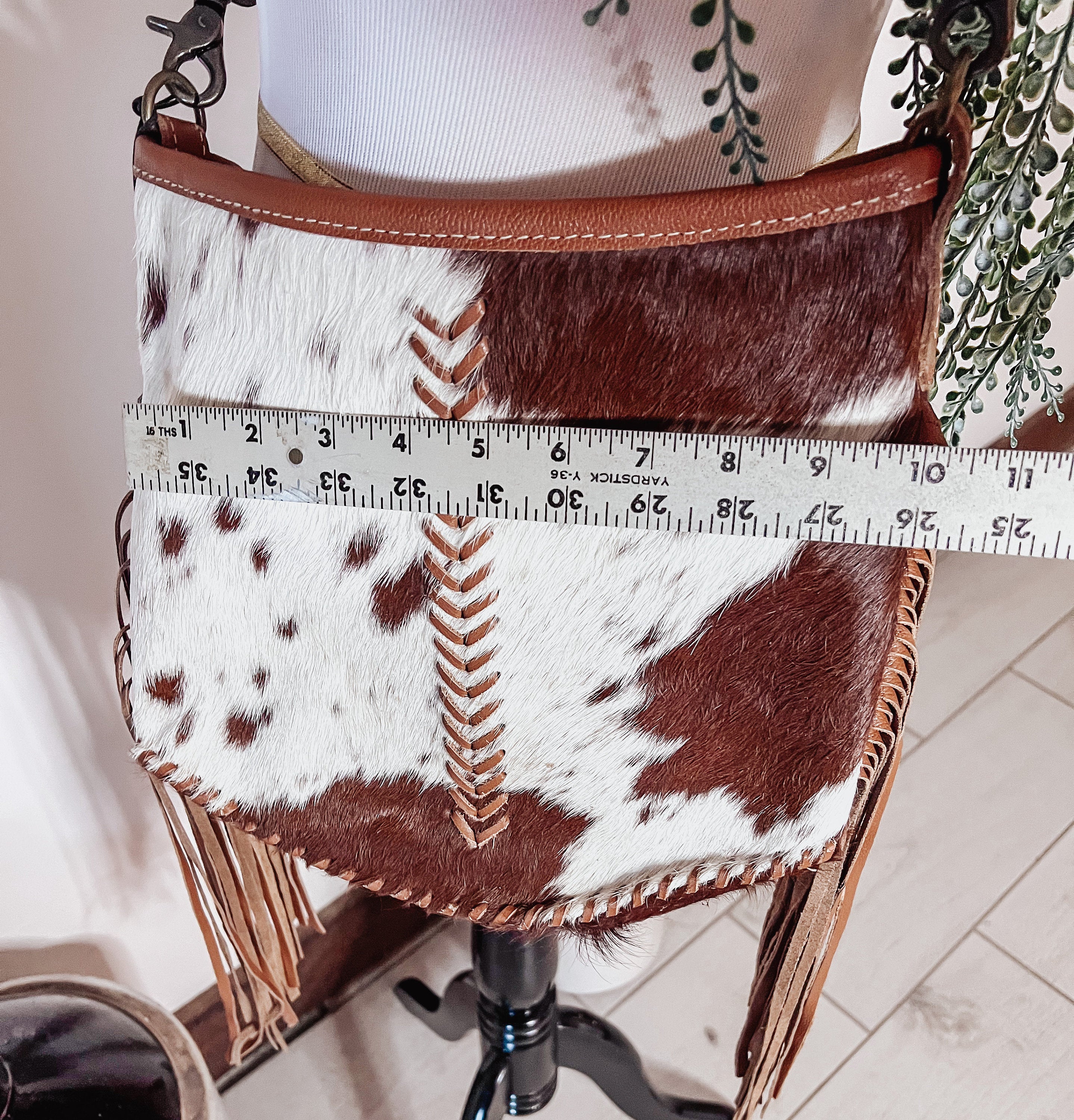 Custom Branded Brown & White Cowhide Tooled Leather Crossbody Purse with fringe we add your Initials Monogram name Farm or Cow Brand