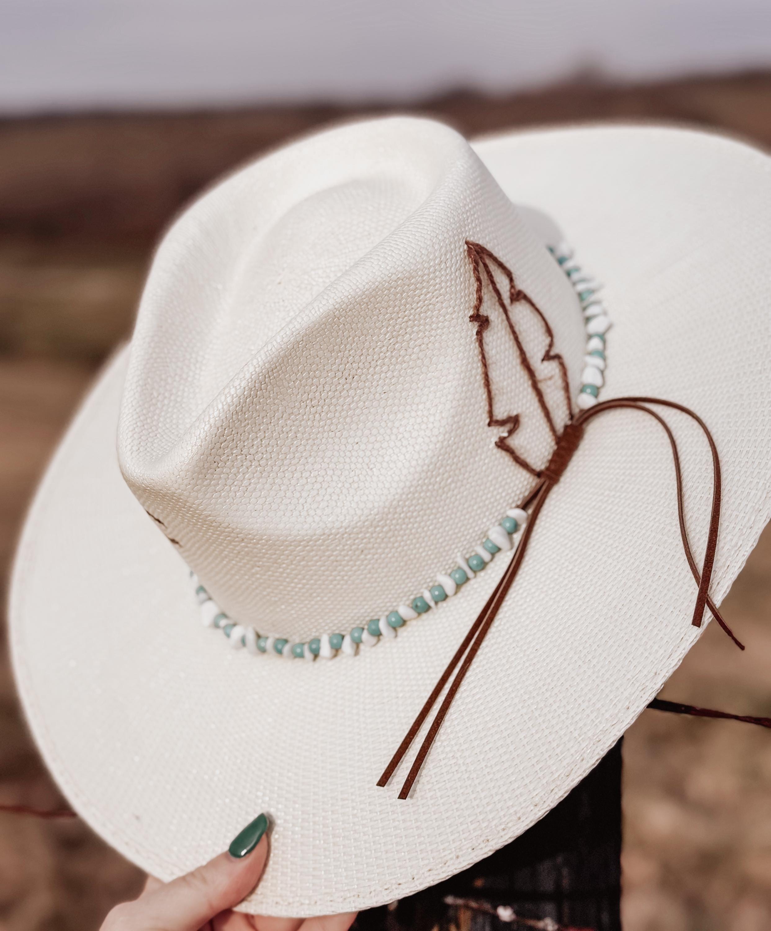 Palm Straw Hat with turquoise and white natural stone hat band, perfect for days on the beach, lake, or river