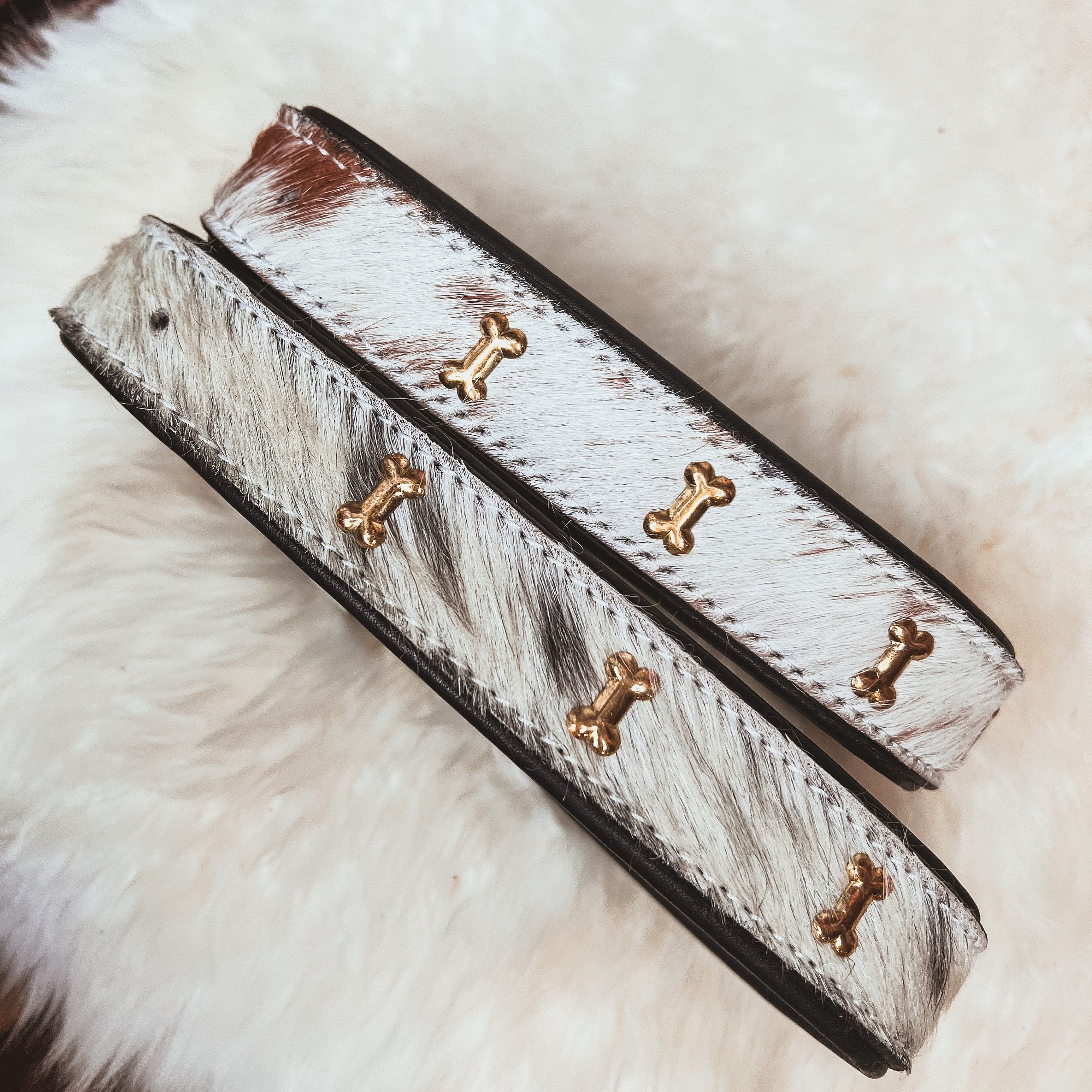 Gorgeous Cowhide adjustable dog collar with adorable gold tone dog bone charms.