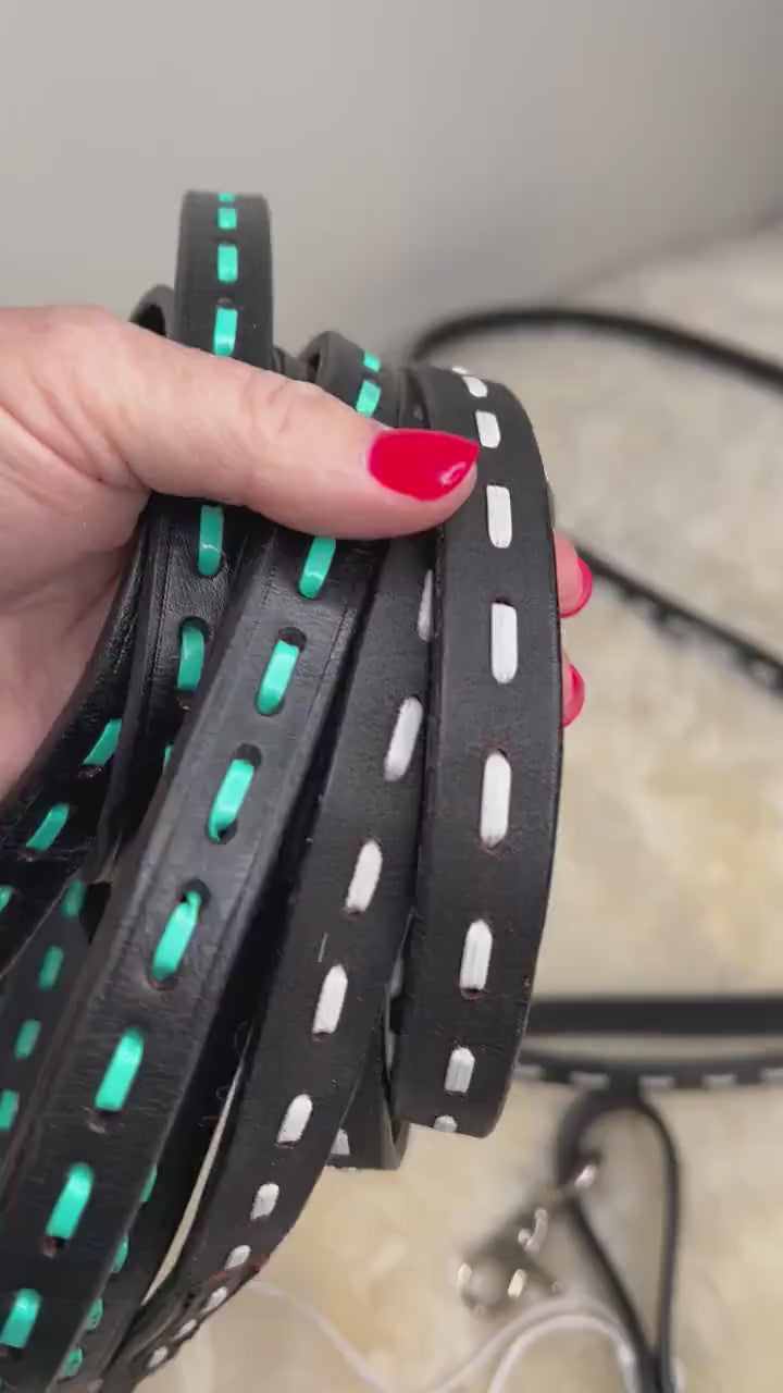 Leather Stitch Style continuous long Horse Reins Turquoise or White Stitch Horse Tack