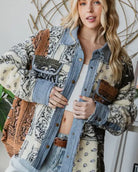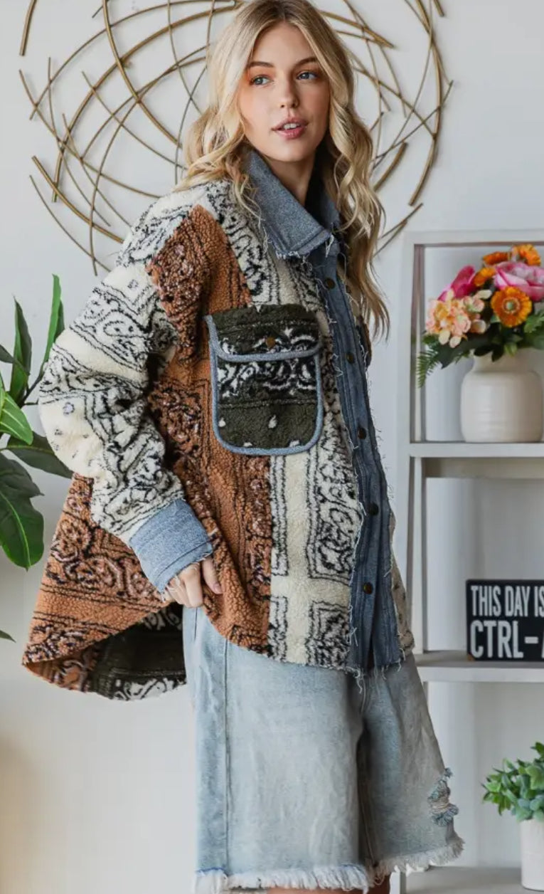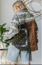 Turn every sidewalk into your own runway with this Mixed Bandana Print Long Sleeve Jacket — a perfect mash-up of cozy and cool. Featuring a bold patchwork of bandana prints, mineral wash details, and soft textured fabrics, this jacket brings that effortlessly laid-back western vibe with a modern twist.