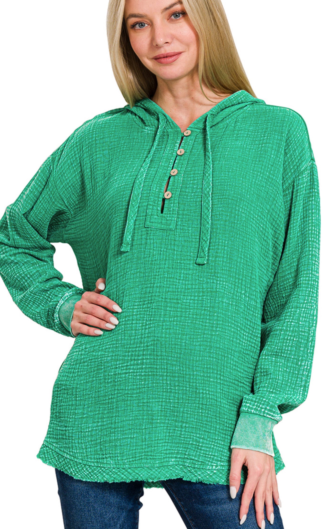 Designed with a relaxed silhouette, this hoodie features a button-front Henley neckline, cozy hood with drawstrings, and raw-edge detailing for that perfectly undone boho vibe. The round hem adds easy movement, making it ideal for pairing with denim, leggings, or cutoff shorts. Lightweight, breathable, and effortlessly cool, this is the kind of piece you’ll reach for year-round.