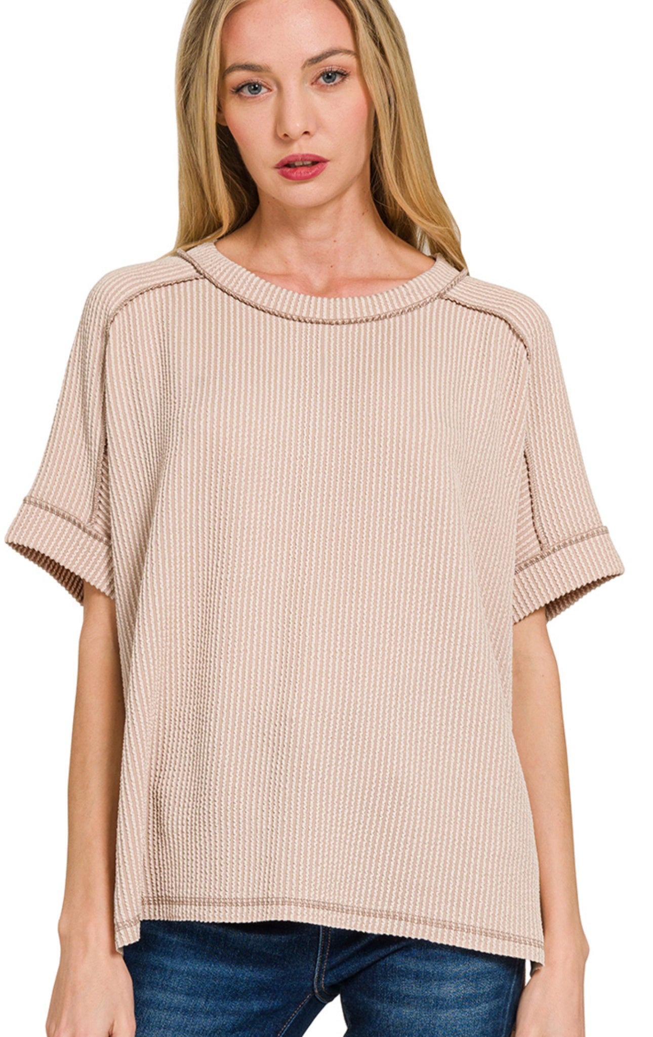 Designed with a raised rib texture, cuffed short sleeves, and raw edge seams, this top gives that lived-in, effortlessly cool look we all love. The oversized, flowy fit makes it incredibly flattering and comfortable, while the lightweight stretch fabric moves with you—no cling, no fuss.