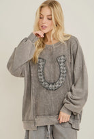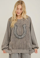 Stay comfy and keep it western with this mineral-washed horseshoe crewneck. The soft, broken-in feel makes it an instant favorite — like it’s already been your go-to for years. The vintage wash gives it that lived-in look, and the bold horseshoe graphic keeps it right on brand for all the horse girls, rodeo run-arounds, and barn-to-town folks.