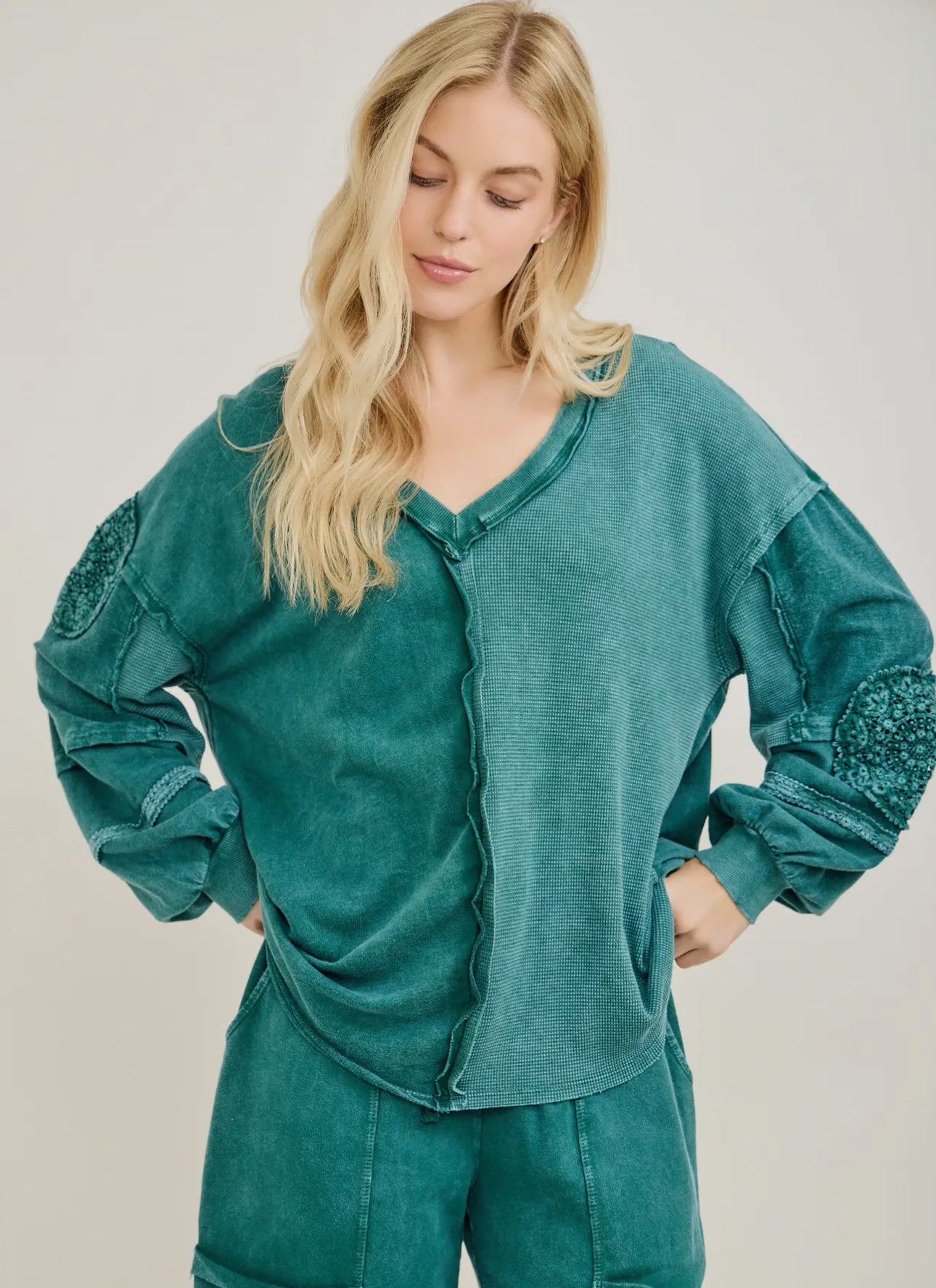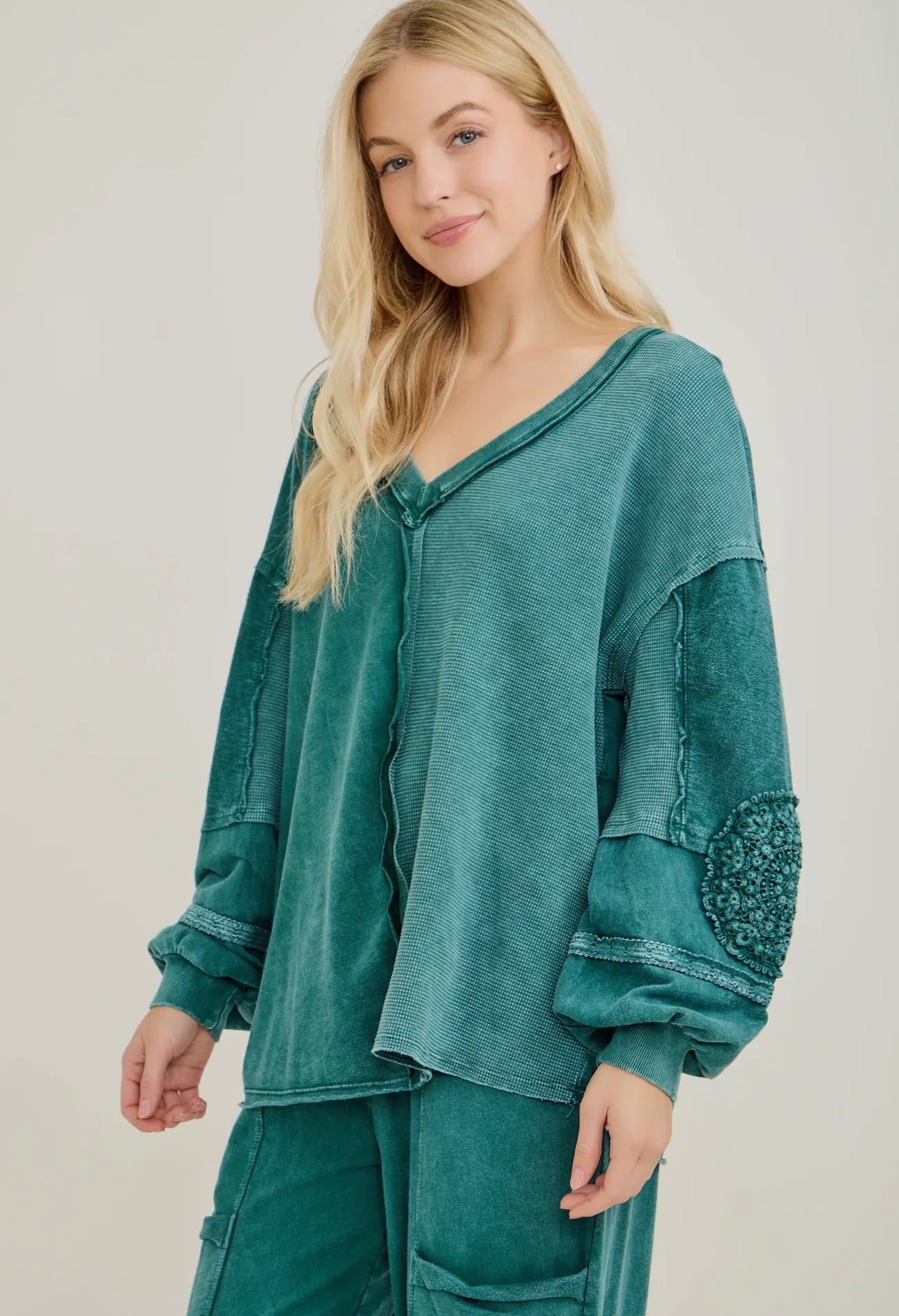 This sweatshirt brings that easy, lived-in comfort with a little extra style. The teal mineral wash gives it a soft, vintage vibe, while the crochet appliqué elbow patches add the perfect touch of texture and personality. It’s relaxed without looking sloppy — cute enough for town, comfy enough for the farm.