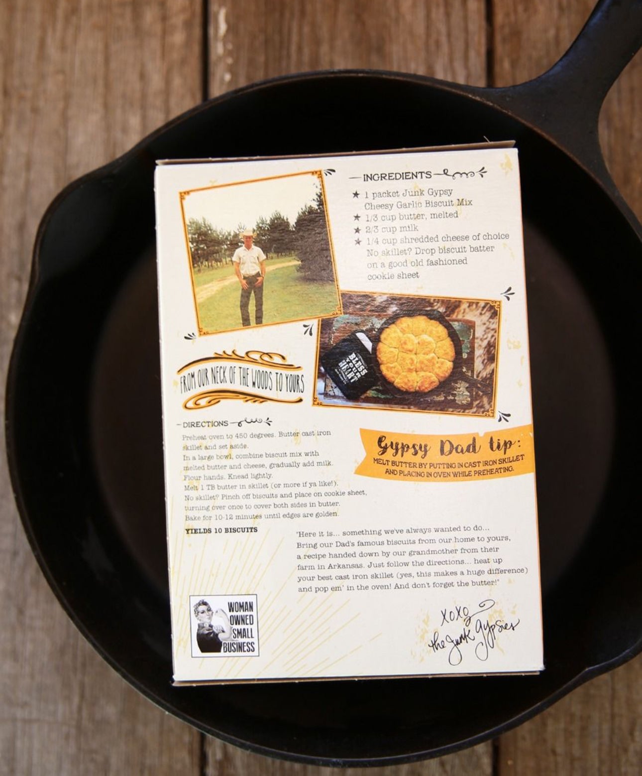 Straight from the Junk Gypsy Kitchen, the Cheesy Garlic Biscuit Mix brings you the legendary Gypsy Dad’s family recipe — a southern staple passed down from his mama on their Arkansas farm.