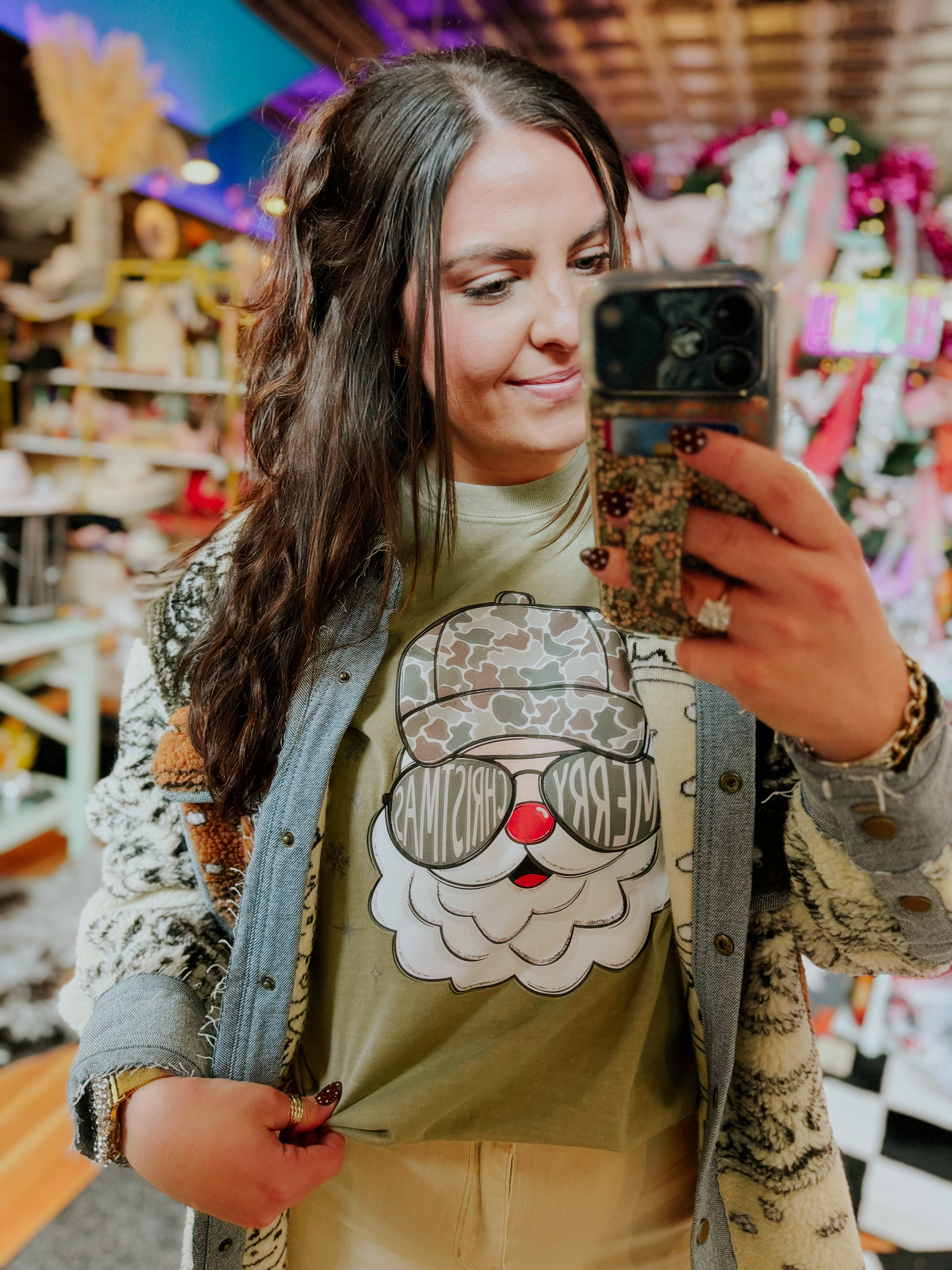 Merry Camo Christmas Tee – Comfort Colors Green Santa Shirt (S–2XL)